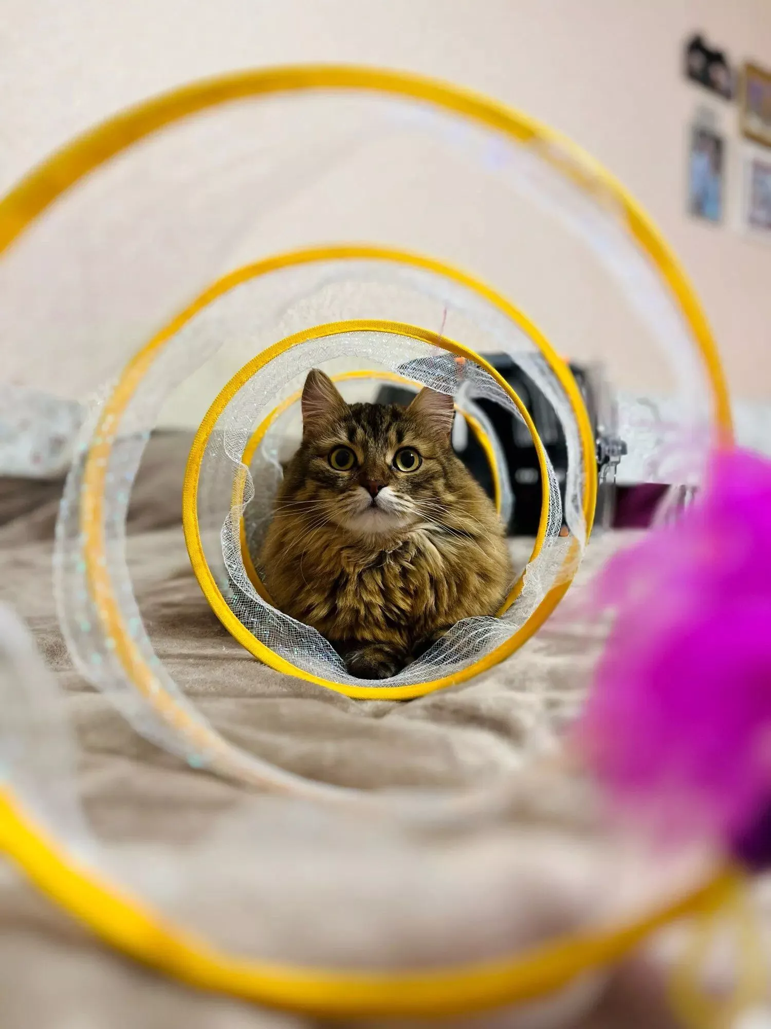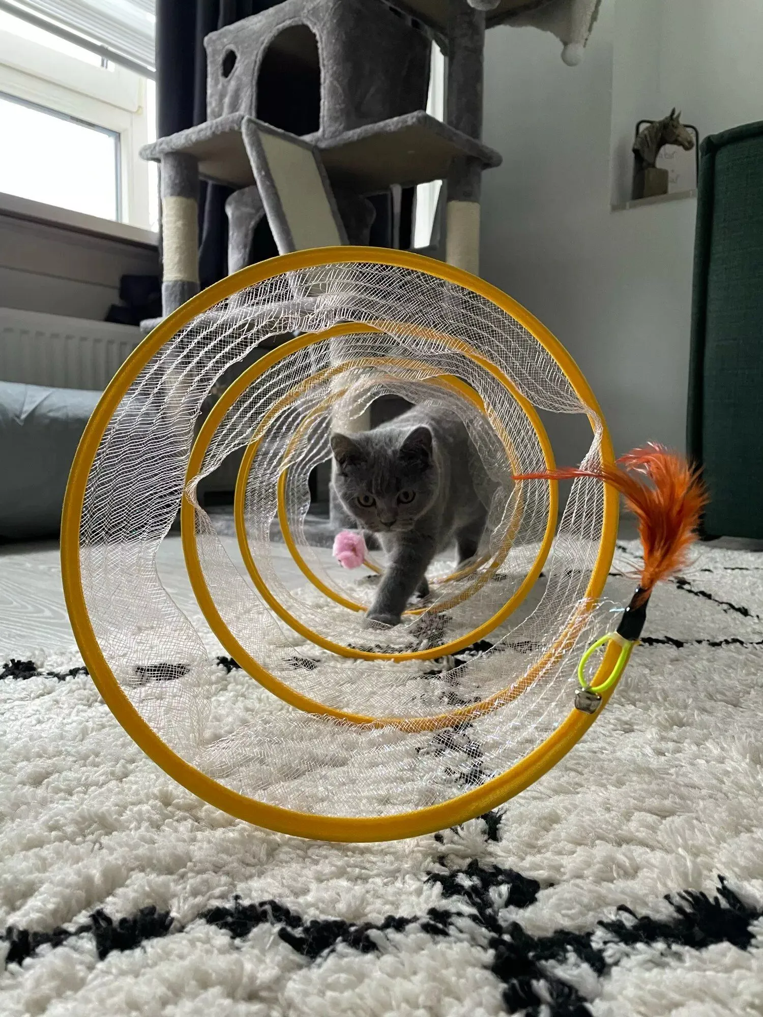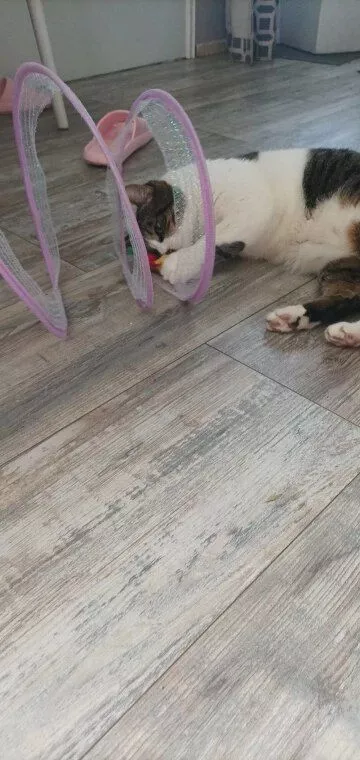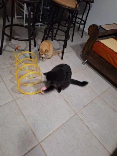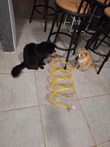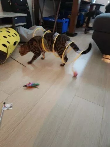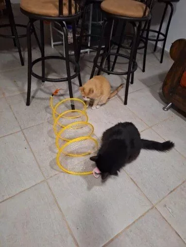 This cat adventure tunnel has been a wonderful purchase. my cats are obsessed with it and spend hours playing in it. they love the crinkly sound and enjoy running through the tunnel and hiding in it. the material is durable and it was very easy to set up. the tunnel is lightweight, making it easy to move around the house to different play areas. it also folds up nicely for storage, which is a big plus. since we got this tunnel, my cats have been more active and entertained. they love the multiple entrances and the spacious interior. it’s great to see them having so much fun and being so playful. this tunnel has been a great addition to their toy collection and has provided endless hours of enjoyment. i’m very happy with this purchase and highly recommend it to other cat owners looking for a fun and durable toy for their furry friends.