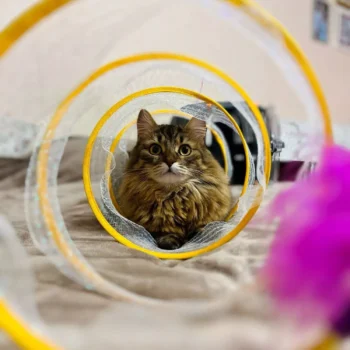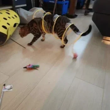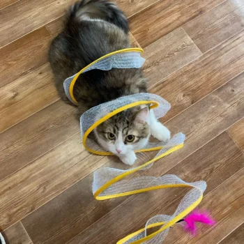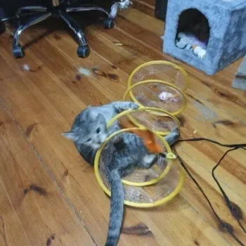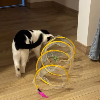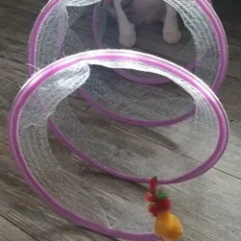This cat adventure tunnel has been a hit with my cats. they absolutely love running through it and playing hide and seek. the material is sturdy and the crinkly texture adds an extra element of fun. it was easy to set up and is lightweight enough to move around the house. the tunnel also folds up nicely when not in use, making it easy to store. since we got this tunnel, my cats have been more active and entertained. it’s great to see them enjoying themselves so much. the tunnel is spacious enough for them to play comfortably and they love the different entrances. this has been a great addition to their toys and has provided endless hours of fun. i highly recommend this tunnel to other cat owners looking for a durable and entertaining toy for their furry friends.
