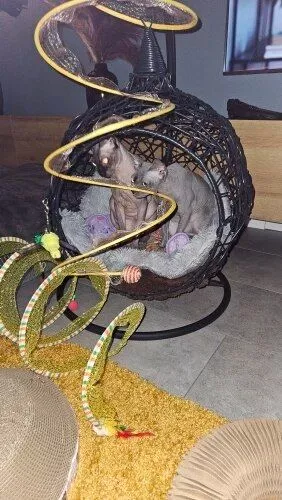 This cat toy surpasses all expectations. Initially purchased for our cats, it has provided endless entertainment for us as well. The thoughtful design incorporates various elements that cats love, from the velvet coil to the jute ball and feathers. It's a hit with our furry friends, and we highly recommend it.