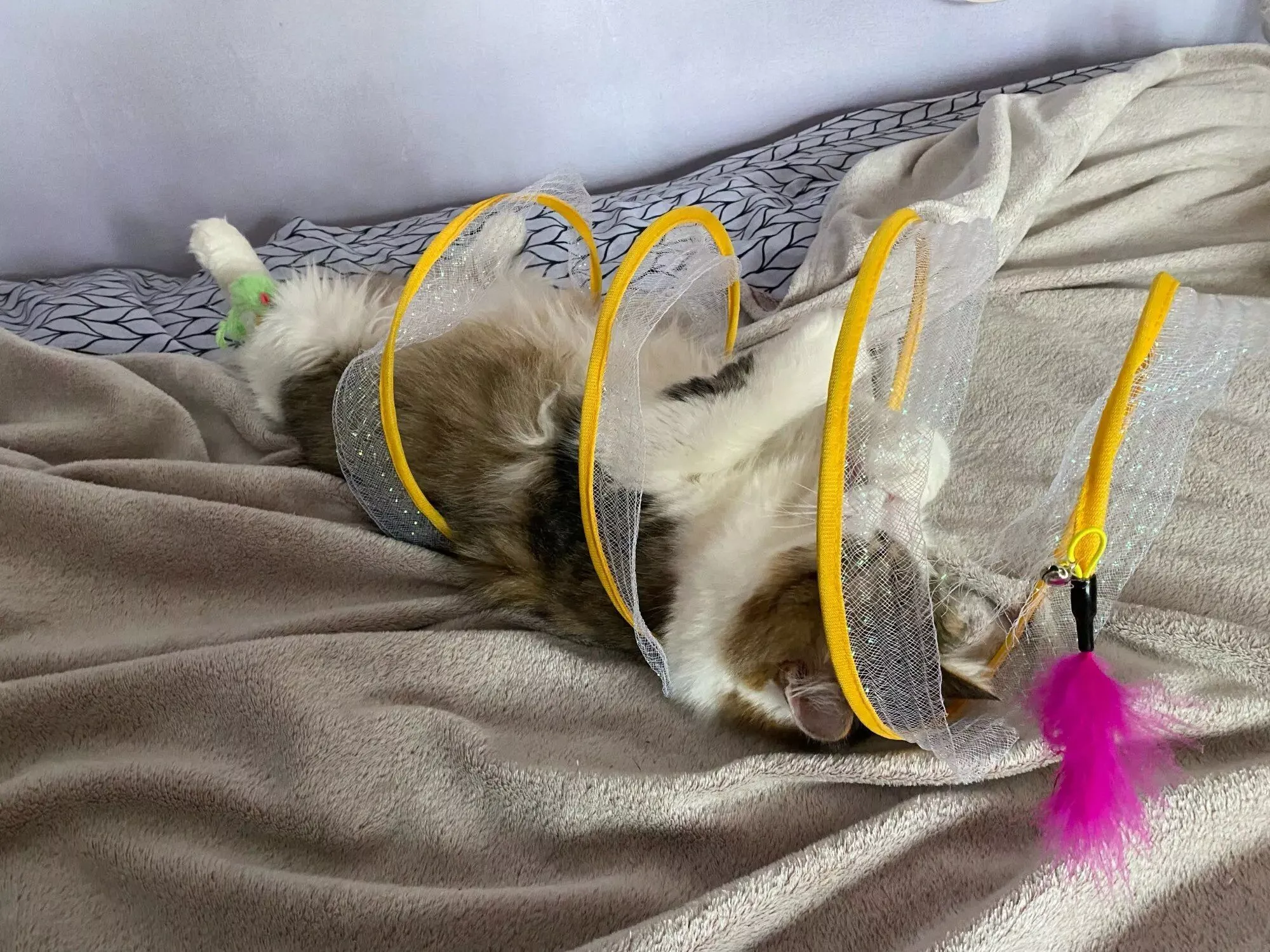 Our kitten likes to play with the toys. Within 1 night she had already got a feather loose.🙈
