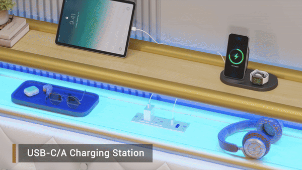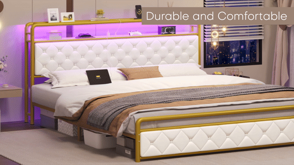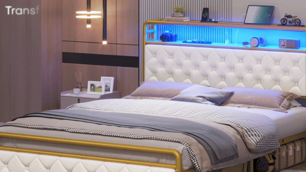 Our bed frame isn’t just about good looks; it’s packed with features that enhance both convenience and usability. The highlight is the innovative headboard, equipped with integrated LED lights for a serene ambiance and a built-in USB port and shelf for easy access to your essentials. Whether it’s a late-night read or charging your devices, everything you need is within arm’s reach.