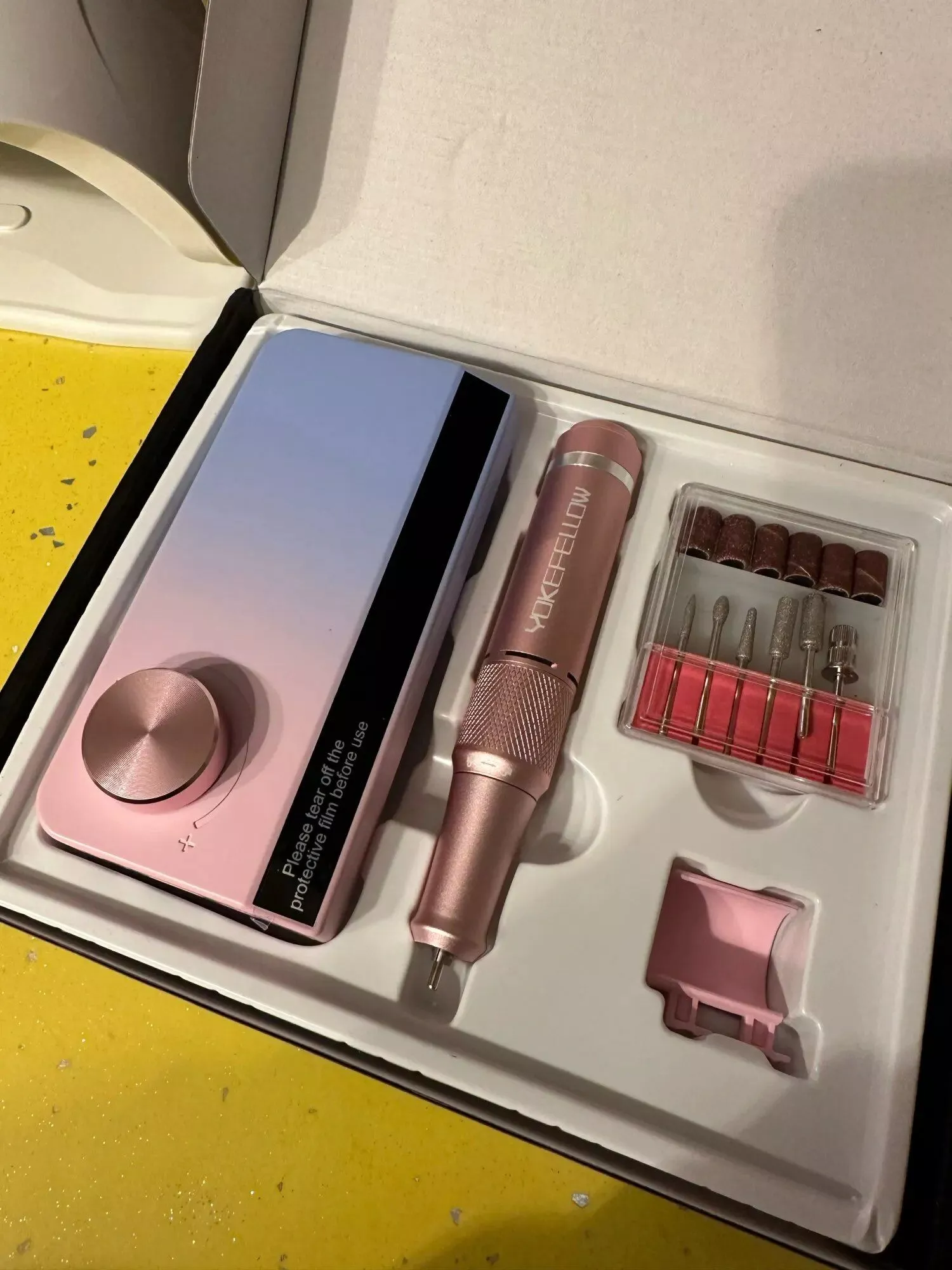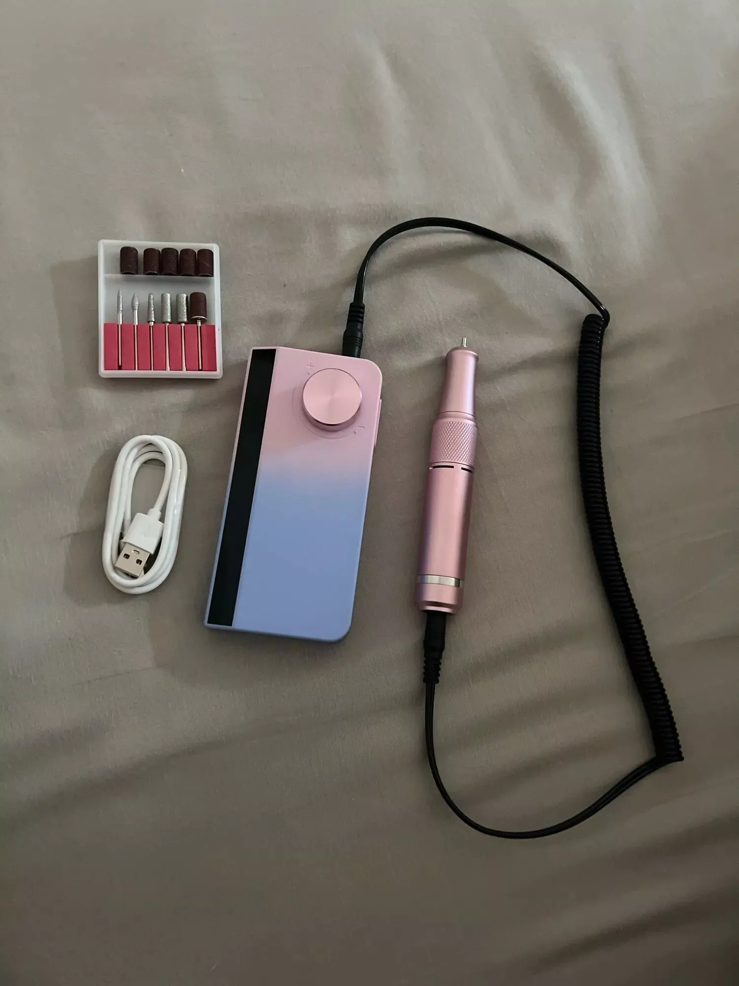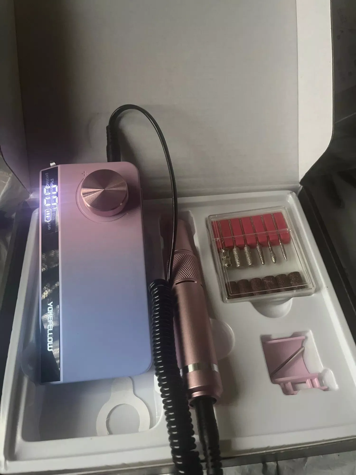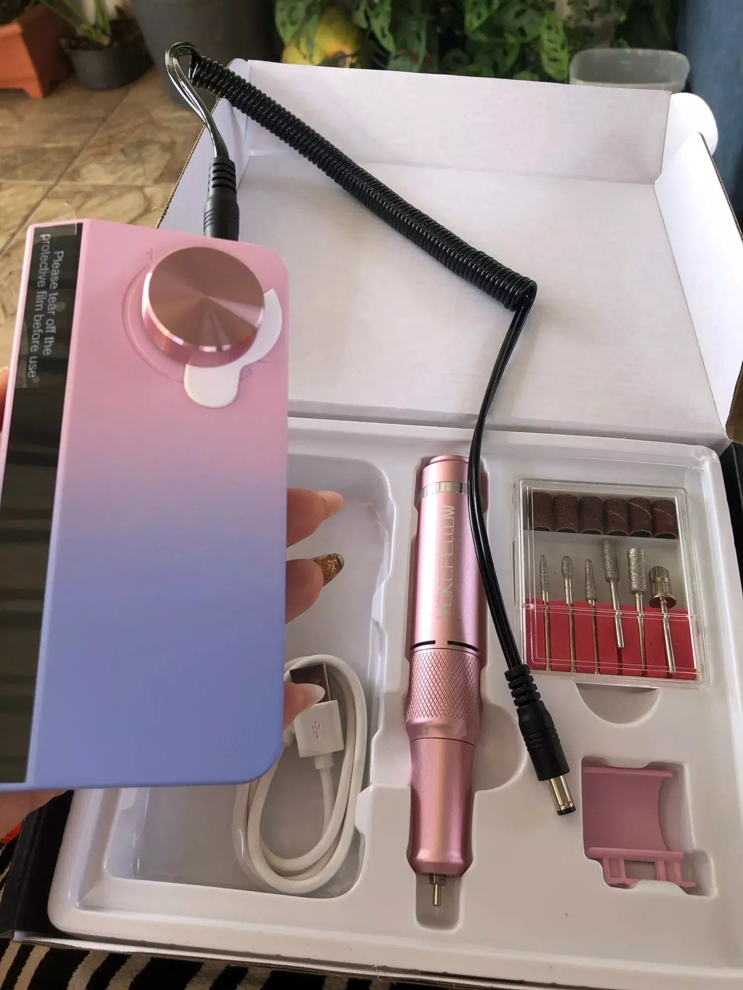 This rechargeable nail drill machine is amazing. it’s very easy to use and perfect for at-home manicures. the drill is powerful and has multiple speed settings for precise control. the rechargeable battery lasts a long time and makes the drill very portable. the attachments are great and cover all my nail needs. the drill is quiet and doesn’t get hot, even with prolonged use. my nails look professionally done every time. it’s a fantastic tool that saves me time and money. i’m very happy with this purchase and highly recommend it to anyone who loves doing their nails.